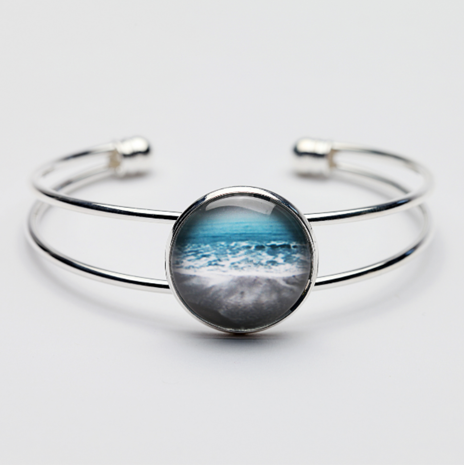 Bangle Bracelets in our Water Collection are designed using original metallic photographs that are set by hand under a 20mm magnifying glass dome. Pair with the matching necklace and add either the post or drop earrings to complete the set. Or mix and match designs from the collection to create your own style. Silver plated brass. Nickel and lead free.