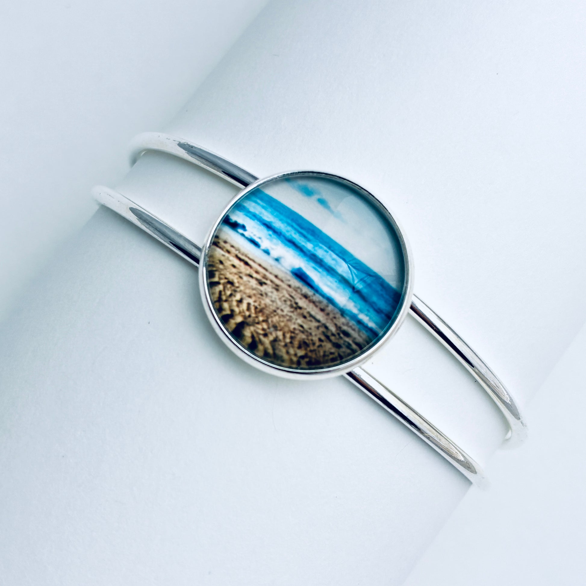 Bangle Bracelets in our Water Collection are designed using original metallic photographs that are set by hand under a 20mm magnifying glass dome. Pair with the matching necklace and add either the post or drop earrings to complete the set. Or mix and match designs from the collection to create your own style. Silver plated brass. Nickel and lead free.