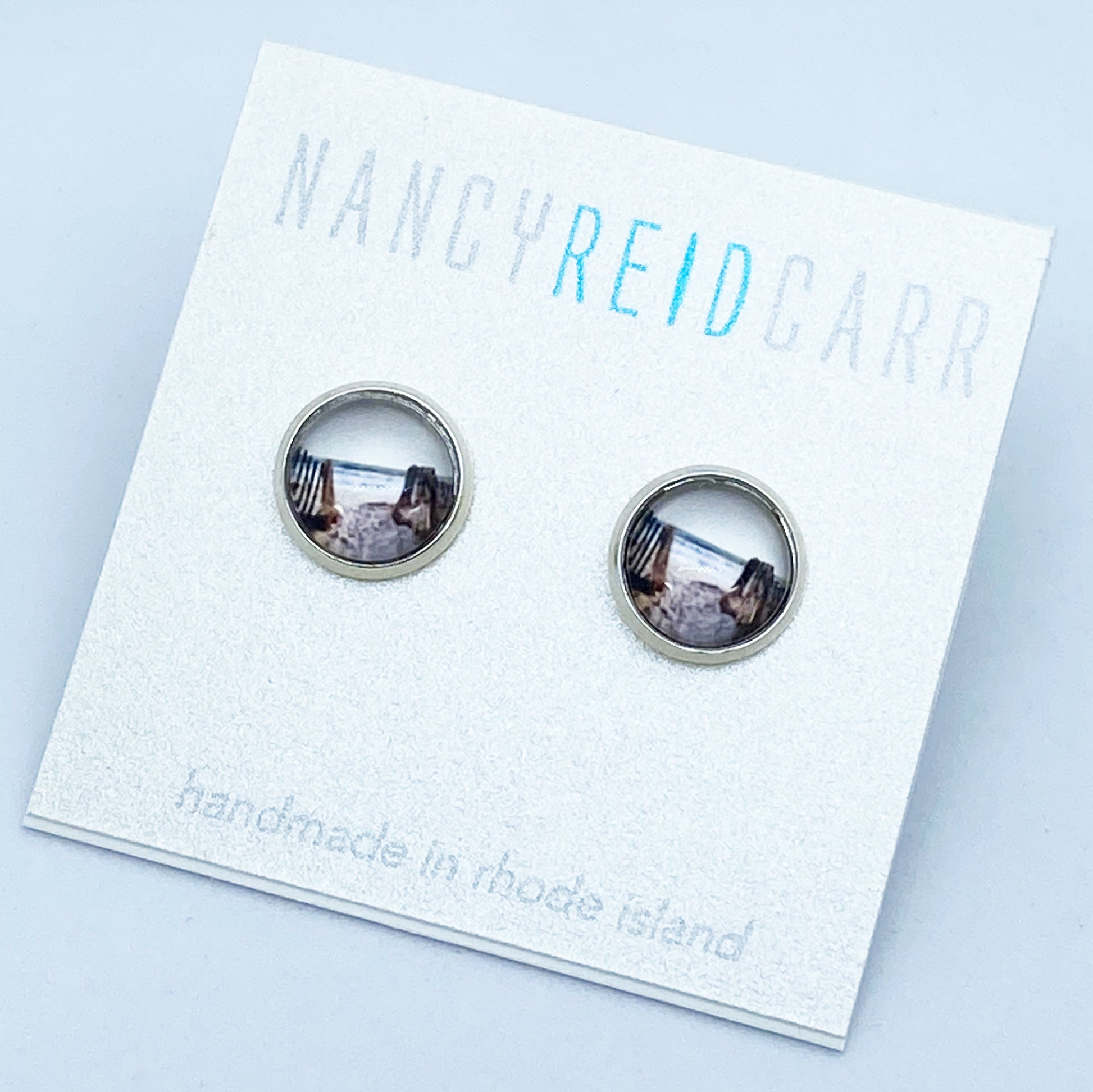 The post earrings in our Water Collection are designed using original metallic photographs that are set by hand under a beautiful 10mm magnifying glass dome. The posts are surgical steel and hypoallergenic. Pair them with the matching necklace, bangle bracelet or a coordinating thin or wide cuff bracelet. Or mix and match designs from the Water Collection to create your own style.