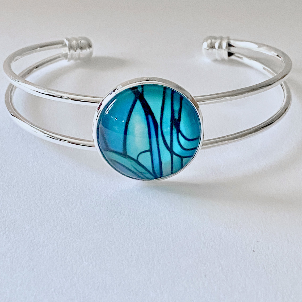 Bangle Bracelets are designed using original metallic photographs or artwork that are set by hand under a 20mm magnifying glass dome. Pair with the matching necklace and add either the post or drop earrings to complete the set. Or mix and match designs from the collection to create your own style. Silver plated brass. Nickel and lead free.