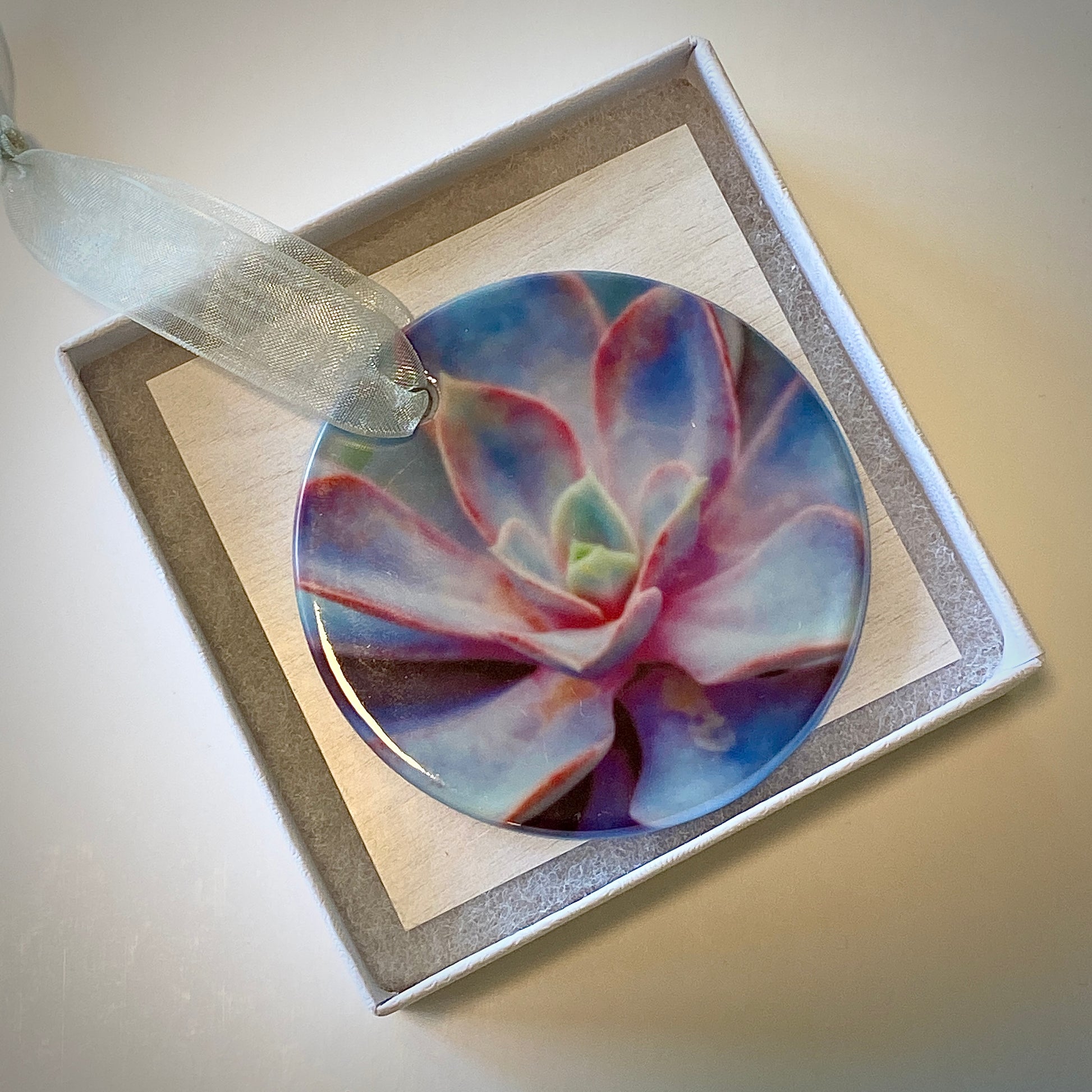 This porcelain ornament makes a perfect gift and looks great hanging on the tree or in a window year-round. It has a nice weight, smooth edges and feels solid in your hand. Designed using one of my original photographs and printed on both sides, it measures 3 inches in diameter. Comes in a gift box with a neutral gray or white ribbon. Handmade in Rhode Island.