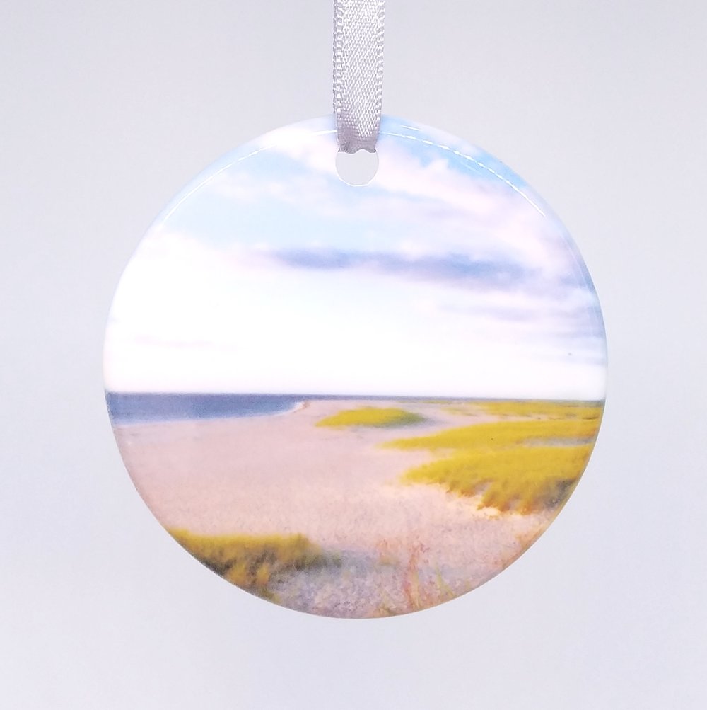 This porcelain ornament makes a perfect gift and looks great hanging on the tree or in a window year-round. It has a nice weight, smooth edges and feels solid in your hand. Designed using one of my original photographs and printed on both sides, it measures 3 inches in diameter. Comes in a gift box with a neutral gray or white ribbon. Handmade in Rhode Island.