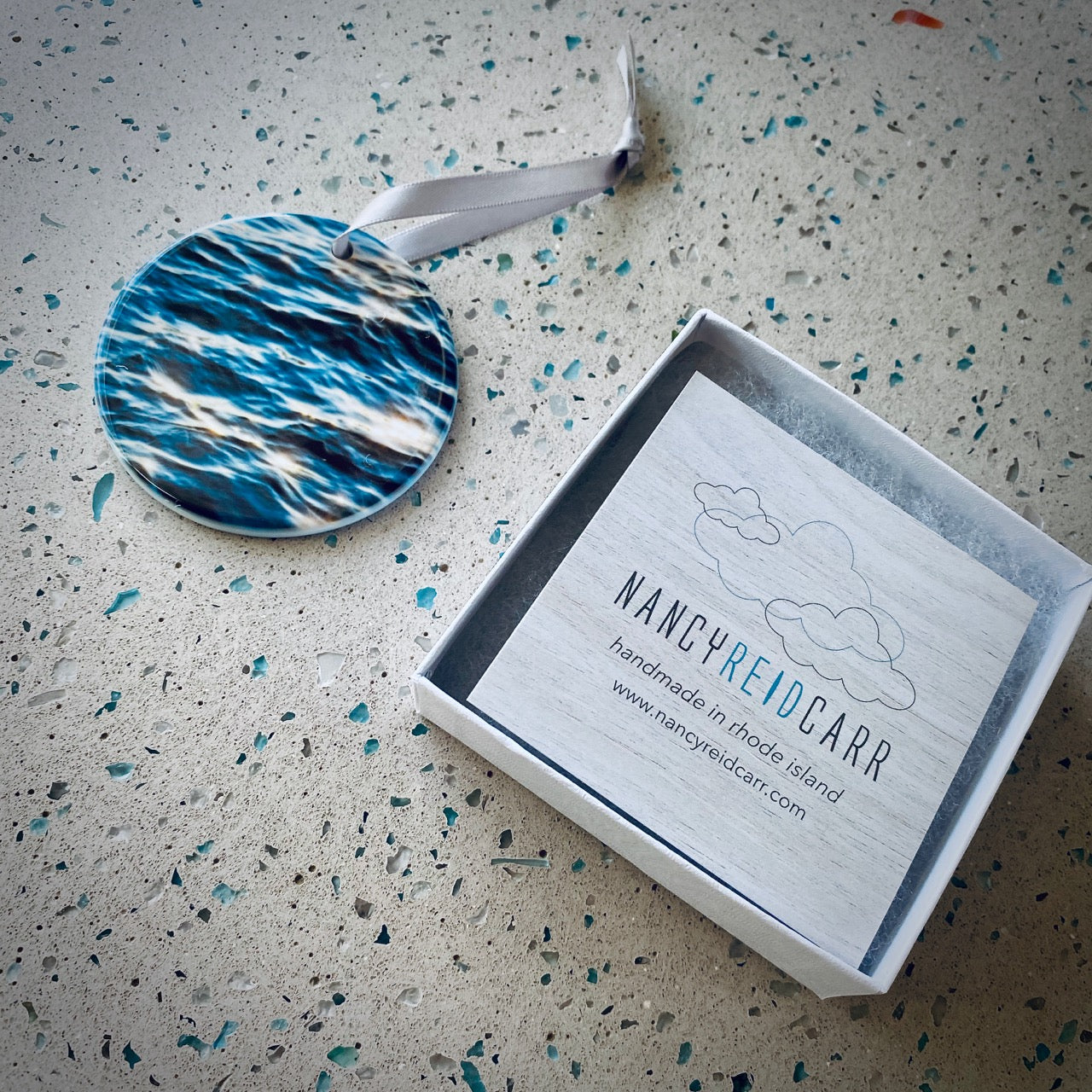 This porcelain ornament makes a perfect gift and looks great hanging on the tree or in a window year-round. It has a nice weight, smooth edges and feels solid in your hand. Designed using one of my original photographs and printed on both sides, it measures 3 inches in diameter. Comes in a gift box with a neutral gray or white ribbon. Handmade in Rhode Island.