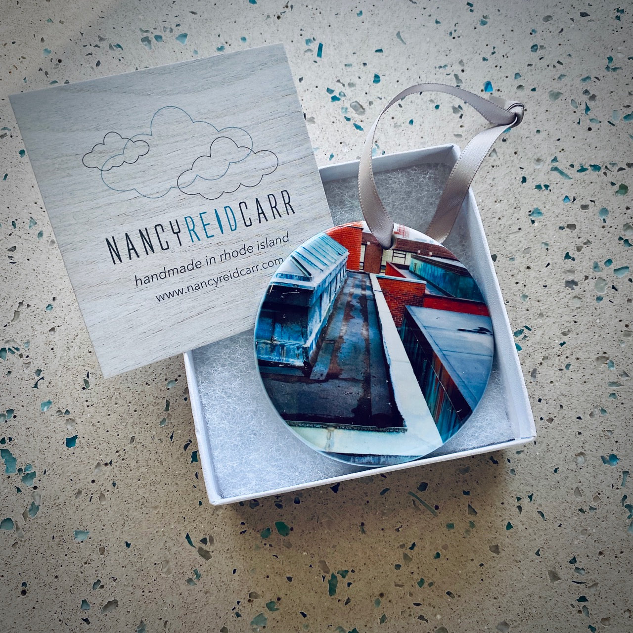 This porcelain ornament makes a perfect gift and looks great hanging on the tree or in a window year-round. It has a nice weight, smooth edges and feels solid in your hand. Designed using one of my original photographs and printed on both sides, it measures 3 inches in diameter. Comes in a gift box with a neutral gray or white ribbon. Handmade in Rhode Island.