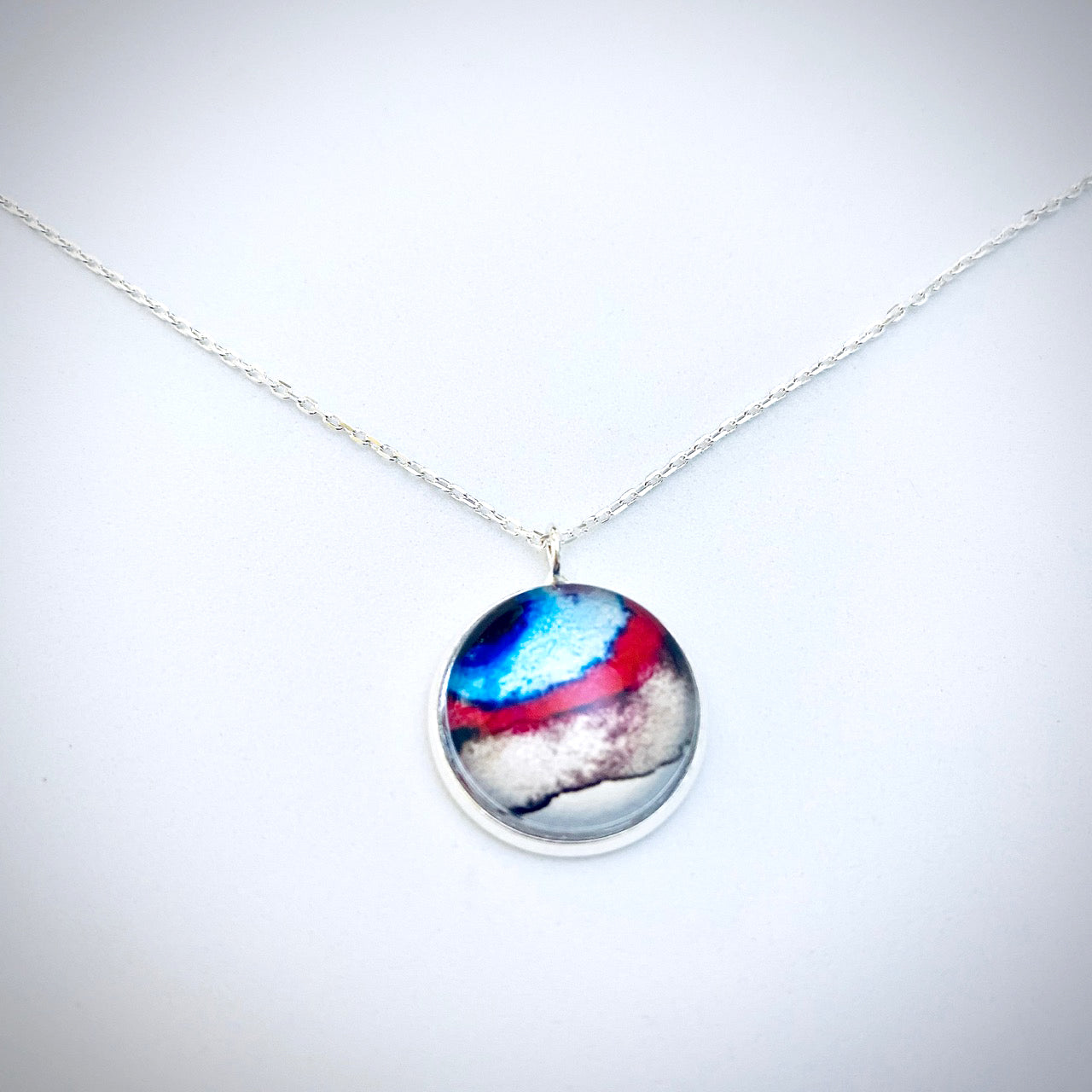 The necklaces in our Watercolor Collection are designed using original paintings that are displayed under a 16mm magnifying glass dome and set by hand. Pair the necklace with the matching bangle bracelet or a coordinating wide or thin cuff bracelet. Add the small post earrings or choose the bolder dangle earrings to complete the set. Chains are sterling silver. Nickel and lead free.