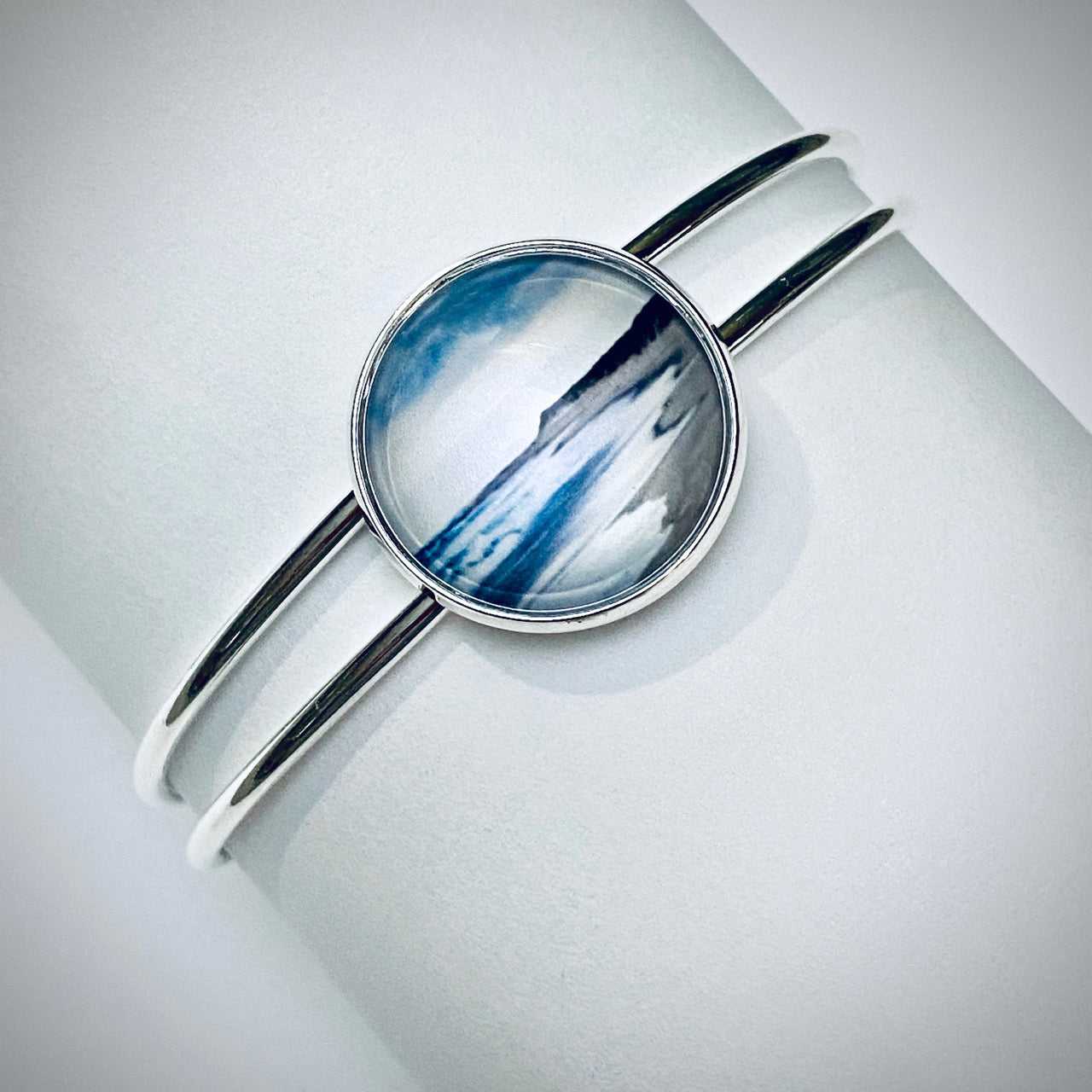 Bangle Bracelets in our Water Collection are designed using original metallic photographs that are set by hand under a 20mm magnifying glass dome. Pair with the matching necklace and add either the post or drop earrings to complete the set. Or mix and match designs from the collection to create your own style. Silver plated brass. Nickel and lead free.